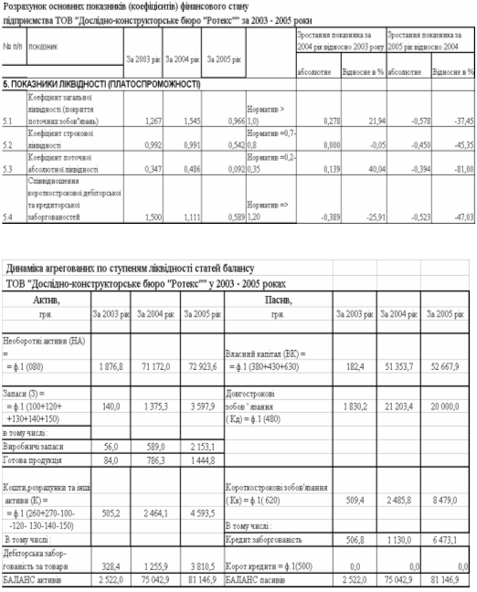 - у 20032004 роках всі нормативи ліквідності балансу в ТОВ «Дослідноконструкторське бюро «РОТЕКС» знаходились вище нормативного діапазону стійкого ліквідного стану підприємства на 2030%, що свідчило про стійкий характер платоспроможності підприємства;