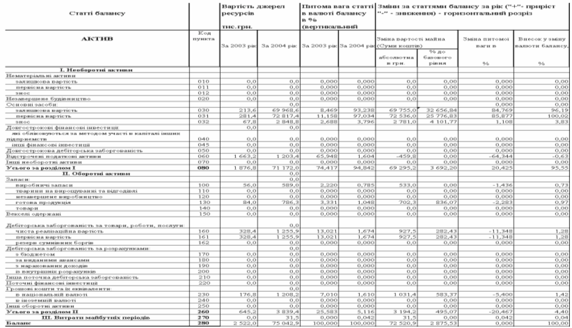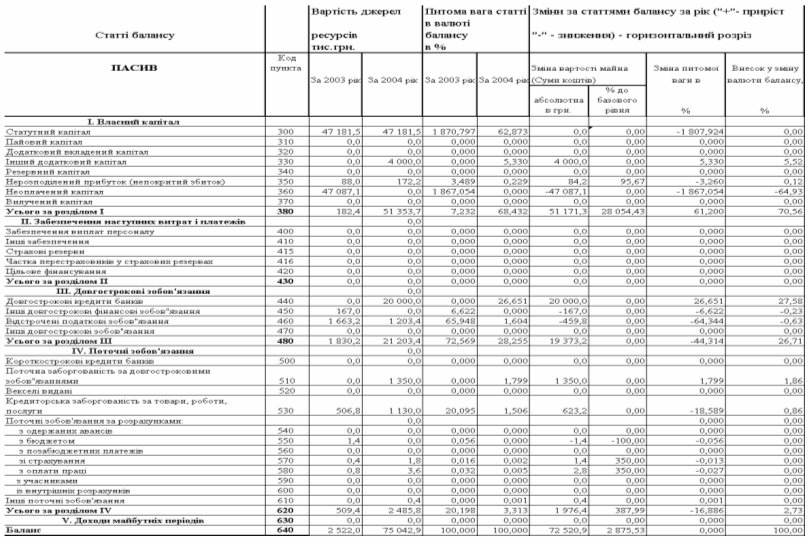 “Вертикальногоризонтальний” аналіз динаміки балансів ТОВ ДКБ „РОТЕКС” за 2003 – 2004 роки