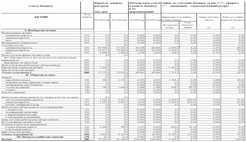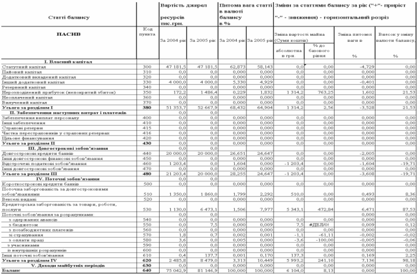 “Вертикальногоризонтальний” аналіз динаміки балансів ТОВ ДКБ “РОТЕКС” за 2004 – 2005 роки