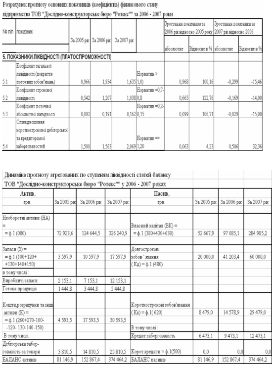 в) Прогнозовані рівні ліквідності, фінансової стійкості та платоспроможності ТОВ „ДКБ РОТЕКС” переміщуються з зон високоризикової діяльності підприємства у 2005 році в зону гарантовано ліквідних та платоспроможних показників діяльності підприємства.