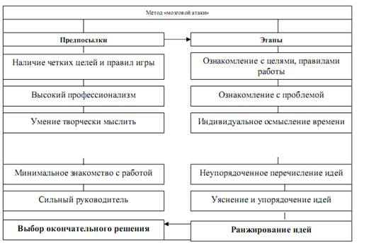 Метод «мозговой атаки» ориентирован на открытие новых идей и достижение согласия в группе экспертов на основе интуитивного мышления. Участники коллективной генерации идей высказывают свои мнения относительно вариантов решения проблемы. Высказывается как можно больше идей, желательно нетривиальных. Оценка и обсуждение идей производится в конце всей процедуры. Суть метода «мозговой атаки» можно представить в виде схемы (рис. 6.1)