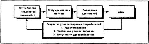 Когда потребность ощущается человеком, она пробуждаетв нем состояние устремленности. Побуждение — это ощущение недостатка в чем-либо, имеющее определенную направленность. Оно является поведенческим проявлением потребности и сконцентрировано на достижении цели. Цели в этом смысле — это нечто, что осознается как средство удовлетворения потребности. Когда человек достигает такой цели, его потребность оказывается удовлетворенной, частично удовлетворенной или неудовлетворенной. Например, если вы ощущаете потребность в сложной работе, это может побудить вас попытаться достичь цели в виде получения места, обеспечивающего ее. Получив такое место, вы можете обнаружить, что работа там на самом деле не такая сложная, как вы предполагали. Это может заставить вас работать с меньшим усердием или искать другое место, на котором ваша потребность будет удовлетворена. На рис. 1 показан такой тип поведения.
