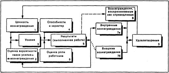 12. Получившая широкую поддержку модель Портера-Лоулера основывается на том, что мотивация является функцией потребностей, ожиданий и восприятия работниками справедливого вознаграждения. Результативность труда работника зависит от приложенных им усилий, его характерных особенностей и возможностей, а также оценки им своей роли. Объем затрачиваемых усилий зависит от оценки работником ценности вознаграждения и уверенности в том, что оно будет получено. Согласно модели Портера-Лоулера результативность труда порождает удовлетворенность, а вовсе не наоборот, как считают сторонники теории человеческих отношений.