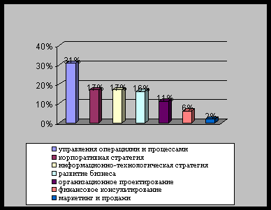 Одними из новых на нашем рынке и наиболее перспективных видов консалтинга являются аутсорсинг и “прокат директоров”. Аутосорсинг (outsourcing) основан на полной или частичной передаче рутинных функций предприятия (например, таких, как бухгалтерские расчеты, расчет налогов, управление персоналом и т.п.) консалтинговой фирме с целью сосредоточения собственных усилий на решении ключевых стратегических задач. “Прокат директоров” используется при временном отсутствии руководства или недавнем увольнении. Организационное развитие и делопроизводство или администрирование, хотя и являются отдельными видами консалтинга, мы отнесли к управленческому консультированию [20, c. 32].