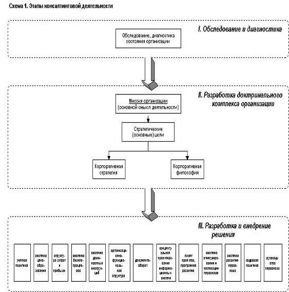 Основной задачей консалтинга является идентификация и нахождение путей решения имеющихся проблем. Консалтинговые услуги осуществляются как в форме разовых консультаций, так и в форме консалтинговых проектов. Существует много разделений консалтингового процесса на этапы ([5], [6], [7], [13] и др.). Любой консалтинговый проект включает в себя следующие основные этапы [36, c. 76]: