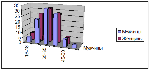 | Возраст (лет) | Мужчины, уд. вес (%) | Женщины д. вес (%) | Всего уд. вес (%) |