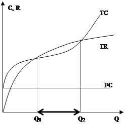 Г-н Липсиц просил студентов запомнить две важные вещи. Во-первых, что TR – это sales или, по крайней мере, выручка от продаж, и называть его принято среди воротил бизнеса именно так, а если кто скажет (при них) ”totalrevenue”, то его просто не поймут, ибо revenue – это доход, а на их языке доход – это прибыль. График издержек производства в точке, соответствующей Q2, делает резкий подъем, что связано с двумя независимыми процессами. С одной стороны, это объясняется крутизной подъема фиксированных издержек (это следует из концепции маржинальных издержек), а, с другой стороны, с этого момента приходит насыщение рынка. Во-вторых, необходимо отметить, что хотя на графике получается две точки пересечения кривых TR и TC, ВЕР’ом является только первая точка (та, которой соответствует объем продаж Q1). Двухсторонней жирной стрелочкой на графике обозначен запас финансовой прочности проекта, то есть то количество продукции, которое будет приносит прибыль. Этот график можно строить исходя из того, что откладываемые по оси абсцисс количества – это либо весь объем производства продукции, либо годовой масштаб производства. Смысл запаса финансовой прочности состоит в том, что по сути он показывает нам степень рискованности нашего проекта. Если он составляет 5-10% от ВЕР, то мы очень сильно рискуем, так как стоит нам чуть-чуть ошибиться в расчетах или капельку изменится экономическая ситуация, как мы очень серьезно пролетим.
