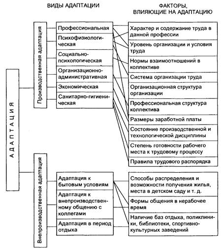 В самом общем виде адаптация — «процесс приспособления работника к условиям внешней и внутренней среды» [3]. Термин «адаптация» чрезвычайно широк и применяется в различных областях науки. В социологии и психологии выделяют социальную и производственную адаптацию. В определенной мере эти два вида адаптации пересекаются друг с другом, но каждая из них имеет и самостоятельные сферы приложения: социальная деятельность не замыкается на производстве, а производственная — включает и технические, и биологические, и социальные аспекты.