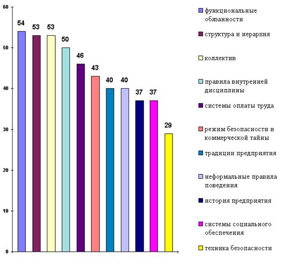 Такая информация, как режим безопасности и коммерческой тайны, техника безопасности, структура и иерархия предприятия по значимости для новичка менее важны (57, 55 и 51 %% соответственно).