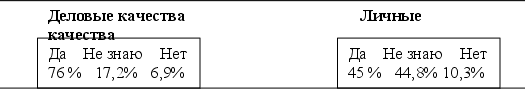 Исходя из приведенных выше оценок, сотрудники более всего выделили трудолюбие, профессиональные знания, заботу о людях, требовательность, отзывчивость и общительность. Самые высокие оценки получили руководители отделов за требовательность – 4,8 балла и общительность – 4,5 балла. Справедливость же и доброжелательность остаются на довольно низком уровне. Это объясняется тем, что сотрудники не видят объективности в оценке руководителей, хотя и принимают их желание общаться и быть в курсе всех дел, но этот стиль не указывает на доброжелательность намерений . Требования находятся на первом месте, что говорит о жесткости большинства руководителей, независимо от их статусного положения.