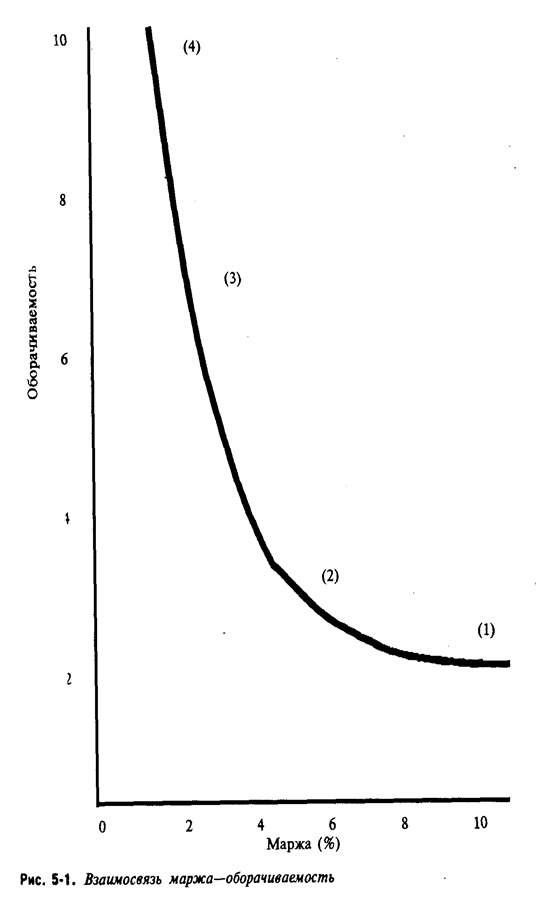 Разделение ПНИ на два компонента показывает, что целый ряд комбинаций маржи и оборачиваемости имеет в результате одну и ту же окупаемость капитальных вложений, как показано ниже: