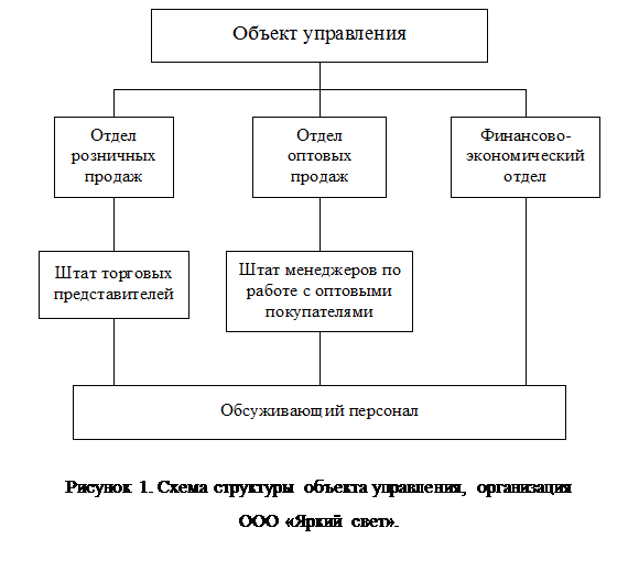 Для рассматриваемой фирмы ООО «Яркий свет» основу управления составляют отношения найма. В этой фирме собственник имеет возможность командовать, в связи с тем, что он, открывая производителю доступ к средствам производства, выступает в роли хозяина и нанимателя производителя. Субъектом управления в этой ситуации является собственник предприятия, а объектом управления является штат наемных сотрудников предприятия. Объект управления представляет собой структурированную группу сотрудников организации, схематично представленную на рисунке 1.