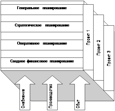 По вертикальной оси сверху располагается генеральное и стратегическое планирование. Это долгосрочное (2–5) лет планирование общих или генеральных целей предприятия (новые рынки, отрасли деятельности, объемы), и стратегий, то есть путей достижения и движения к этим целям. При смещении вниз сроки планирования уменьшаются, а детальность увеличивается.