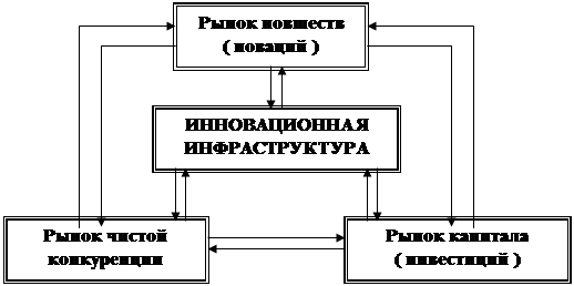 Общеизвестно, что переход от одного качества к другому требует затрат ресурсов (энергии, времени, финансов и тому подобное). Процесс перевода новшества (новации) в нововведение (инновации) также требует затрат различных ресурсов, основными из которых являются инвестиции и время. В условиях рынка как система экономических отношений купли – продажи товаров, в рамках которой формируются спрос, предложение и цена, основными компонентами инновационной деятельности выступают новшества, инвестиции и нововведения. Новшества формируют рынок новшеств (новаций), инвестиции рынок капитала (инвестиций), нововведения (инновации) рынок чистой конкуренции нововведений. Эти три основных компонента и образуют сферу инновационной деятельности (рис.1.1.).