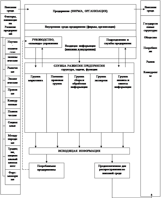 Т.О., целесообразно рекомендовать хозяйствующим объектам иметь в своей структуре специальное подразделение, ответственное за подготовку условий успешного развития предприятия – информационную службу. Предприятие, стремящееся к успешному выходу на рынок, закреплению на нем, усилению конкурентных позиций, а в перспективе – к лидерству, должно в первую очередь обладать как можно более полной информацией о состоянии и динамике внешней среды – о конъюнктуре, объеме и структуре рынков, а также о состоянии внутрифирменной среды – о производственных и интеллектуальных возможностях реализации практических и стратегических задач.