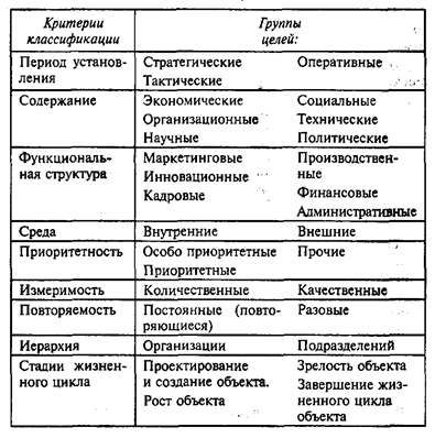 Как правило, организации ставят и реализуют не одну, а несколько целей, которые важны для их функционирования и развития. Наряду со стратегическими целями и задачами приходится решать огромное количество текущих и оперативных. Кроме экономических — стоят социальные, организационные, научные и технические задачи. Наряду с регулярно повторяющимися, традиционными проблемами менеджеры должны принимать решения по непредвиденным ситуациям и т.д. Классификация целей позволяет конкретизировать задачу целеполагания и использовать соответствующие механизмы и методы, наработанные для разных групп целей. Один из возможных вариантов классификации целей представлен в табл. 5.1.