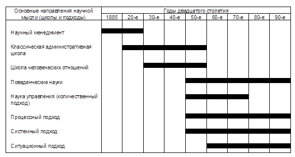 В развитии научных подходов в менеджменте можно выделить ряд основных направлений управленческой мысли, каждое из которых стало существенным этапом в ее эволюции. Это научный менеджмент, классическая административная школа, школа человеческих отношений, поведенческие науки, количественный подход, системный подход, ситуационный подход. Хронологическая последовательность развития теории и практики менеджмента в ХХ в. представлена на рисунке (см. Рис. 1.)