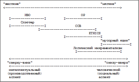 Сюда же может быть наложен континуум интеллектуальный - социальный аспекты проведения изменения. Положение в данном континууме характеризует положение центра тяжести используемого подхода (т.е. на какой аспект изменения направлено большее внимание).