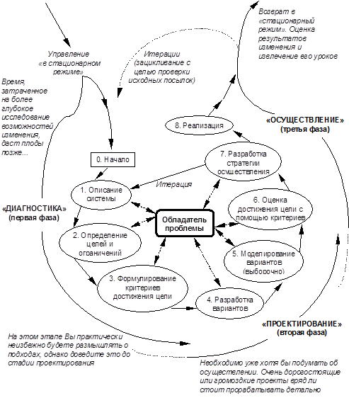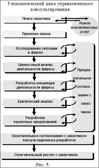 Однако даже такое, достаточно подробное рассмотрение типов проблем, которые вызывают необходимость анализа систем управления предприятием, все же скрывает сами методы, критерии которыми пользуются профессиональные консультанты. Абстрактный ответ на этот вопрос легко позволит получить реконструктивный анализ технологии работы консультантов, а в широком смысле – аналитиков систем управления. Рисунок технологического цикла управленческого консультирования приведен на рисунке (см. Рис. 5)