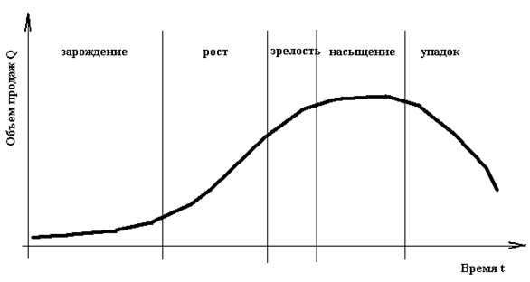 Жизненный цикл товара можно представить в виде графика зависимости объема продаж от времени существования (жизни) этого товара. Типовой график представлен на рис. 1, на котором выделены основные этапы жизни товара.