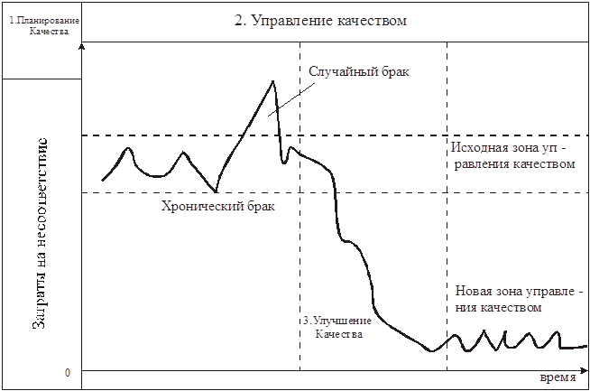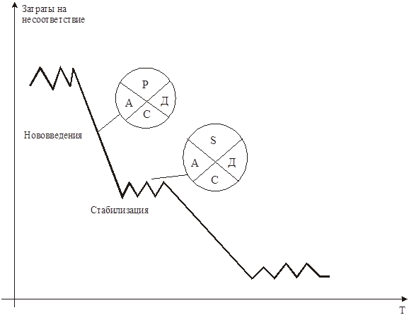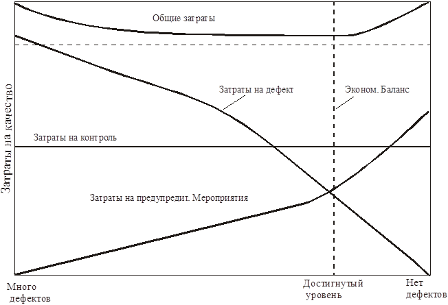 Основой концепции обеспечения качества этой стадии можно сформировать так : потребитель должен получить только годные изделия. Внедрение в жизнь этой концепции привело уже в 20-е годы к тому, что численность контролеров в высокотехнологических отраслях стало составлять до 40% от числа производственных рабочих. В рамках этой концепции повышения качества всегда сопровождается рост затрат на его обеспечение, т.е. цели повышения эффективности производства и повышения качества изделия является противоречивыми.