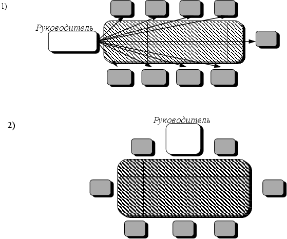 Лидер такого типа обладая достаточной властью, навязывает свою волю исполнителям, единолично принимает и отменяет решения, не дает возможности проявить инициативу подчиненным, категоричен, часто резок с людьми. Всегда приказывает, распоряжается, наставляет, но никогда не просит. Основное содержание его управленческой деятельности состоит из приказов и команд. Все новое воспринимается таким руководителем с осторожностью, или вообще не воспринимается, в управленческой работе он практически пользуется одними и теми же методами. Таким образом, вся власть сосредоточивается в руках такого руководителя, получившего название автократа. Даже размещение сотрудников в процессе проведения совещания ориентировано на постоянный контроль их деятельности (Рис b 1.). Это создает напряженную обстановку, подчиненные в этом случае сознательно или интуитивно стремятся избегать тесного контакта с таким руководителем.