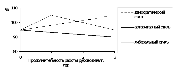 Влияние стилей управления на эффективность работы групп в течение продолжительного времени исследовали и немецкие ученые. Было установлено, что результативность труда постоянно повышалась у коллектива, где преобладал демократический стиль руководства, снижение эффективности – у коллектива с либеральным и авторитарным стилем .