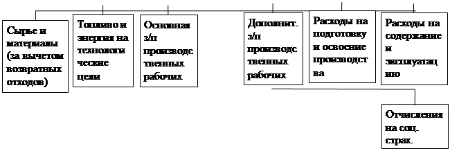 | 1.Сырье и материалы 2.Возвратные отходы 3.Покупные изделия и полуфабрикаты 4.Топливо и энергия на технологические цели 5.Заработная плата основная и дополнительная с отчислениями. 6.Общепроизводственные расходы. 7.Общехозяйственные расходы. Итого производственная себестоимость. 8.Внепроизводственные расходы. Всего полная себестоимость |