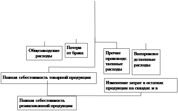 Сумма прямых и косвенных затрат на изделия, производимые в цехах, составляет цеховую себестоимость изделия. Если к цеховой себестоимости изделия прибавить общезаводские расходы, то получим сумму всех производственных затрат на данный вид изделия - производственную себестоимость. Если к производственной себестоимости прибавить внепроизводственные расходы (расходы на реализацию), то получим полную себестоимость изделия.