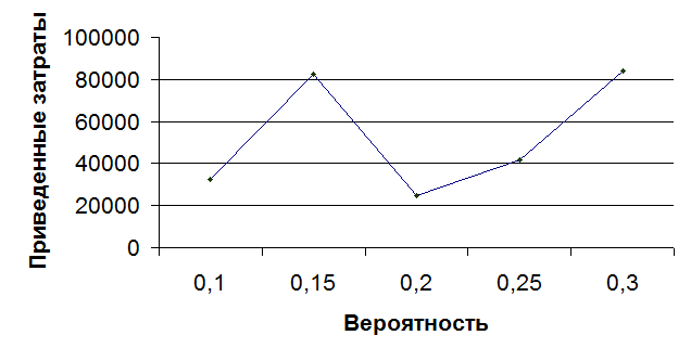 Таким образом, минимальные затраты при минимальной вероятности, а максимальные затраты - при максимальной вероятности. При вероятности р=0,15 достаточно малой, слишком большие затраты. Остаются две точки с вероятностью р=0,2 и р=0,25. Однако при небольшом приросте затрат, график показывает достаточный прирост вероятности.