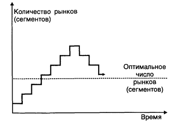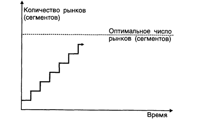 Дисперсный или "метод стрекозы" (см. рис.3) реализуется путем проб и ошибок. Он предполагает выход фирмы сразу на максимально возможное количество сегментов рынка с тем, чтобы впоследствии постепенно осуществить отбор наиболее выгодных, "плодоносных" рыночных сегментов.