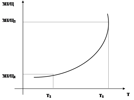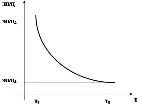 Точки на оси абсцисс (Т) – величины требующегося труда, а на оси ординат (ЗП/Ц) – величины реальной заработной платы (3П/Ц). Точка с координатами (Т1 ; ЗП/Ц1 ) является примером того, что низкой заработной плате ЗП/Ц1 соответствует большой спрос на труд Т1 , и наоборот (точка с координатами (Т2 ; ЗП/Ц2 )).