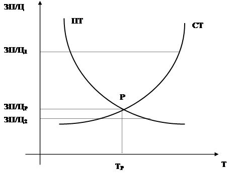 Очевидно, что оно достигается в точке Р, которой соответствует определенный уровень заработной платы ЗП/ЦР и заданное этим уровнем предложение труда ТР . Это означает, что все предприниматели, согласные платить зарплату ЗП/ЦР , находят на рынке необходимое количество работников. Точка Р определяет положение полной занятости.