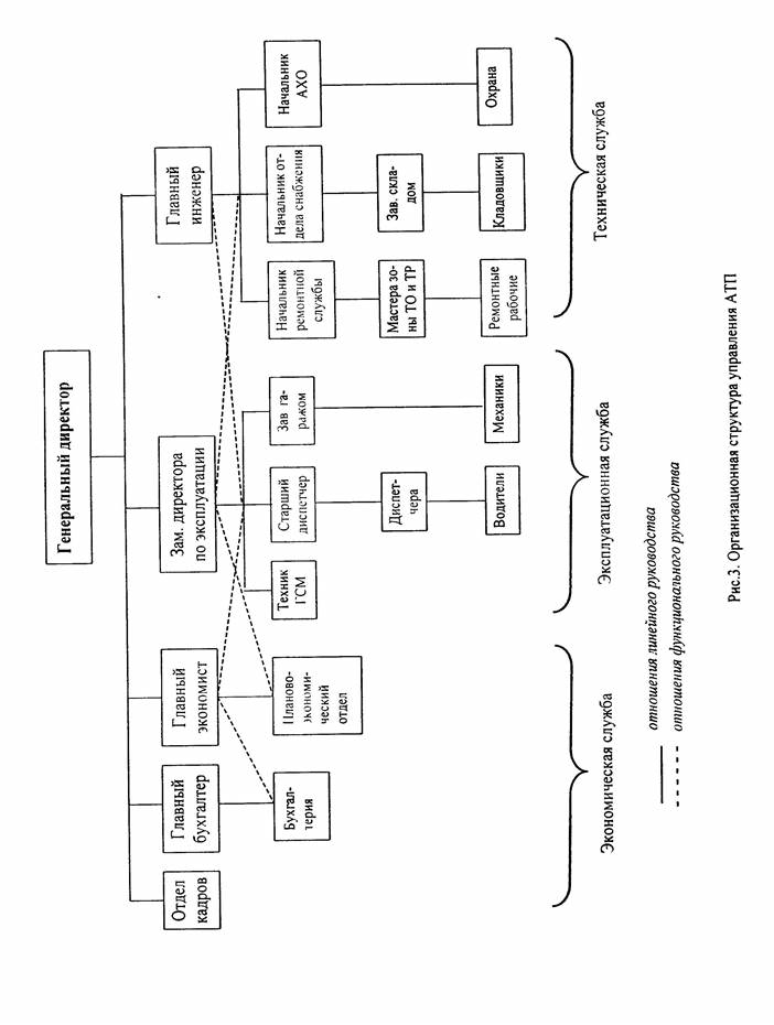 Как видно на схеме. ОСУ АТП является линейно-функциональной. На линейные звенья управления возлагаются функции и права командования и принятия решений, а на функциональные подразделения (планово-экономический отдел к примеру) – методическое руководство при подготовке и реализации решений по планированию, организации, учету, контролю и анализу по всем функциям производственно-хозяйственной деятельности. Эта структура - механистическая, характеризующаяся использованием формальных процедур и правил, жесткой иерархией власти в организации, централизацией принятия решений.