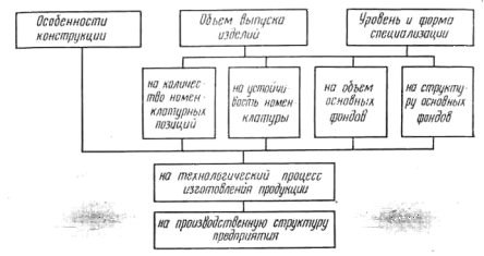 ее изготовления; уровнем специализации и производственным профилем предприятия; способами изготовления продукции, т. е. составом и сложностью применяемых технологических процессов. Схема взаимосвязи факторов, определяющих производственную структуру завода, приведена на рис. 1.