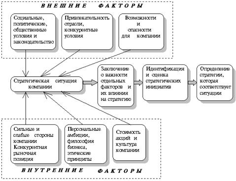 Описанный нами интеллектуальный процесс позволяет выявить то, что компания могла бы сделать в отношении к существующим в рыночной среде возможностям, а также то, на что она способна в отношении к актуальным способностям и ресурсам. Кроме того, указанный процесс позволяет привести эти две точки зрения в некое оптимальное соответствие. При определении стратегии необходимо также принять во внимание — вне зависимости от чисто экономических соображений, — какой путь развития предпочитает глава компании и его ближайшее окружение. Личные ценности, надежды и идеалы могут и должны оказывать влияние на итоговое решение, а потому мнение и желание руководства компании непременно должны войти в состав стратегического решения.