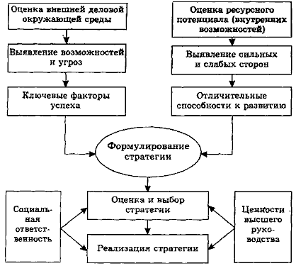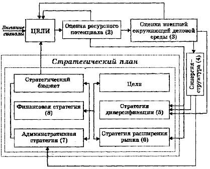 Согласно этой модели процесс стратегического планирования начинается с определения первоначальных целей развития предприятия, которые являются реакцией на внешние сегменты. В соответствии с этими целями проводится анализ и оценка ресурсного потенциала предприятия и внешней деловой окружающей среды. Целью такого рода анализа является выявление возможностей для принятия основных стратегических решений по дальнейшему проникновению на рынки сбыта и диверсификации производства.