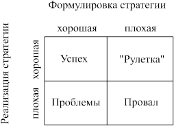 Качество стратегии и эффективность механизма ее реализации - главные условия успешной деятельности по достижению цели. Возможные варианты сочетаний реализации стратегии и формулировки стратегии представлены на рис.5.