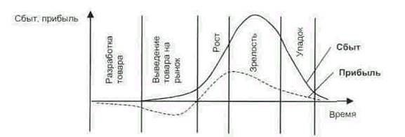 Рис. 2. Жизненный цикл товара: характер изменения сбыта и прибылей.