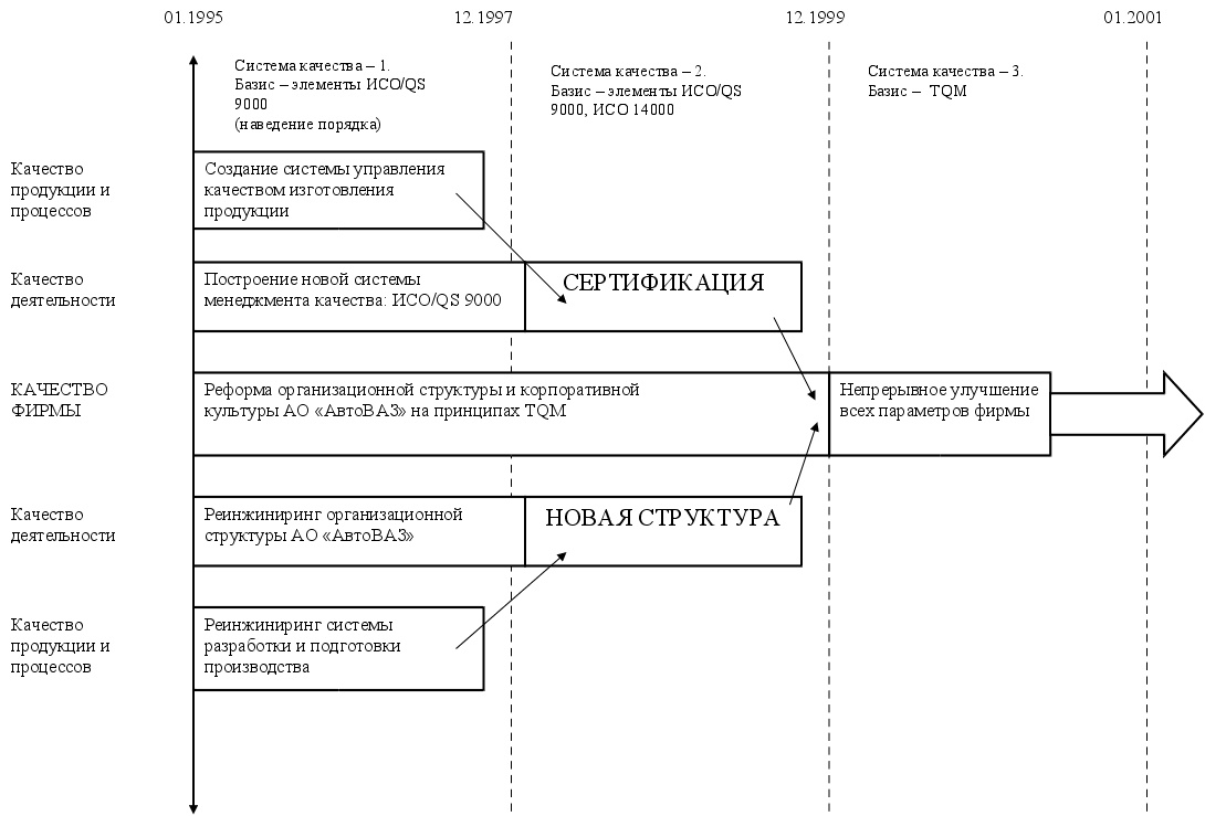 Работа в этом направлении начата с разработки новой философии качества и массового обучения работников АО "АвтоВАЗ" принципам и методам TQM, а также с разработки программ реформирования АО "АвтоВАЗ".