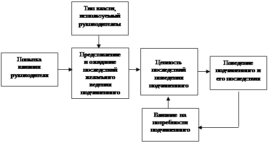Все формы влияния побуждают людей исполнять желания другого человека, удовлетворяя неудовлетворенные потребности или препятствуя их удовлетворению, или они побуждают исполнителя ожидать, что потребность будет или не будет удовлетворена в зависимости от поведения исполнителя. Как мы уже говорили, люди строят предположения относительно того, что может произойти, если они будут вести себя определенным образом. Видя именно такое поведение, человек начинает представлять в уме воздействие его или ее поведения на состоянии его или ее потребностей. А руководитель также представляет эффект своего влияния на поведение будущего исполнителя. В результате руководитель и исполнитель усваивают схожую или несхожую манеру поведения на будущее. Этот процесс влияния руководителя на подчиненного показан на рис.2.