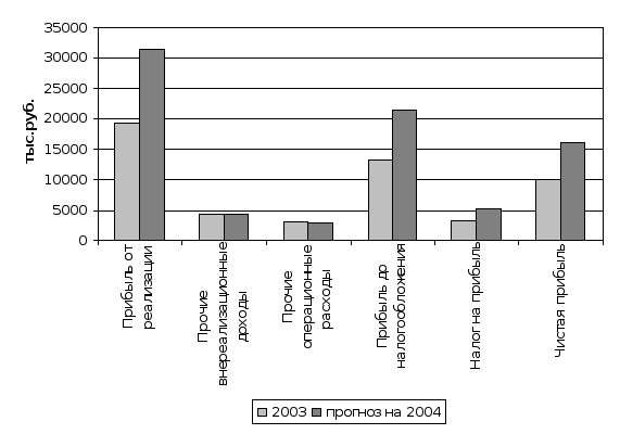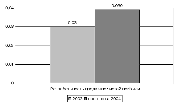 В третьей части дипломной работы были проработаны выявленные резервы увеличения прибыли и уровня рентабельности предприятия ОАО «Волгогазоаппарат» и составлен прогноз на 2004 год. На основе расчета плана прогноза по товарообороту, валовым доходам, издержкам обращения, спрогнозировано увеличение прибыли в 2004 г. на 11869 тыс.руб. (за счет снижения издержек обращения на 6682 тыс.руб. и за счет перевыполнения плана товарооборота на 5187 тыс. руб.). При этом соответственно прогнозируется повышение рентабельности продаж предприятия до 3,9 %.