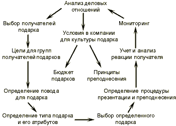 "Процесс планирования поведения компании относительно преподнесения подарков" определяется двумя главнейшими условиями: бюджетом, выделенным на подарки, и принципами преподнесения подарков. Бюджет подарков фиксируется ежегодно. Он высчитывается исходя из количества и степени важности получателей. В соответствии со степенью важности подарков для компании бюджет подарка может составлять от 2 до 4% рекламного бюджета компании. Принципы преподнесения подарков имеют важнейшую значимость для поддержания и развития в компании культуры подарка. Они отражают правила и возможное поведение работников в качестве дарителей и получателей. Эти правила преподнесения подарков включат в себя, например, следующие пункты: