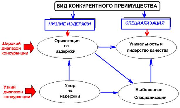 При этом в любой данный момент времени строится стратегия обеспечения конкурентоспособности, опираясь лишь на один из видов конкурентных преимуществ – либо на более низкие издержки, привлекая покупателей относительной дешевизной товаров по сравнению с аналогичными изделиями других производителей, либо на специализацию, вызывая интерес у наиболее взыскательных и требующих, прежде всего, высокого качества клиентов.