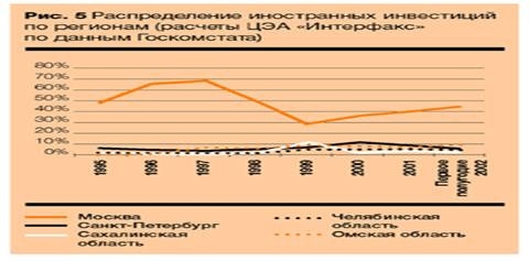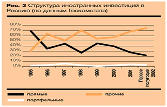 По данным Госкомстата России, накопленный объем иностранных инвестиций в экономику России к концу 2002 года составил 42 928 млн долл. США, что на 20,5% больше, чем в 2001 году.При этом произошел качественный сдвиг в структуре накопленного капитала – если по состоянию на конец 2001 г. преобладающая доля приходилась на прямые инвестиции, то сейчас на первое место вышли «прочие инвестиции», осуществляемые на возвратной основе (18 307 млн. долл.). На прямые инвестиции приходится 16 121 млн. долл., на портфельные – 1 473 млн. долл.США. Таким образом, иностранные инвесторы предпочитают предоставлять средства в долг, интерес же к собственно участию в капитале российских предприятий не столь очевиден.