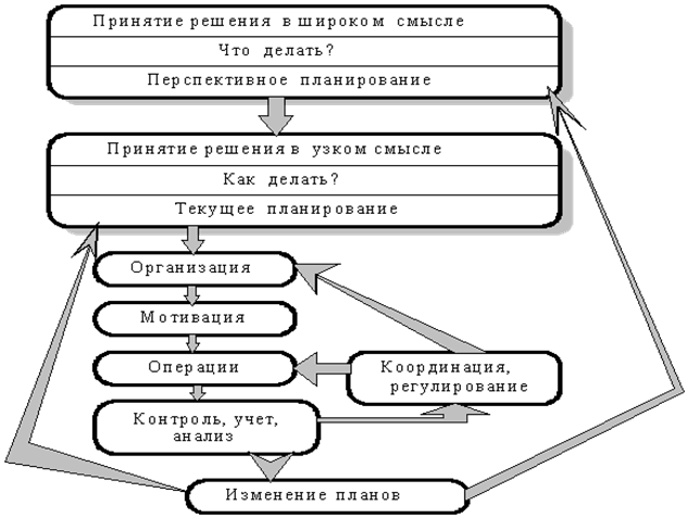 Як правило, процеси управління фірмою дуже різноманітні, багатогранні і мають складну структуру (складаються з великого числа стадій і фаз). У загальному значенні процес управління складається з загальних функцій управління, що поєднуються в цикли управління (рис.1).