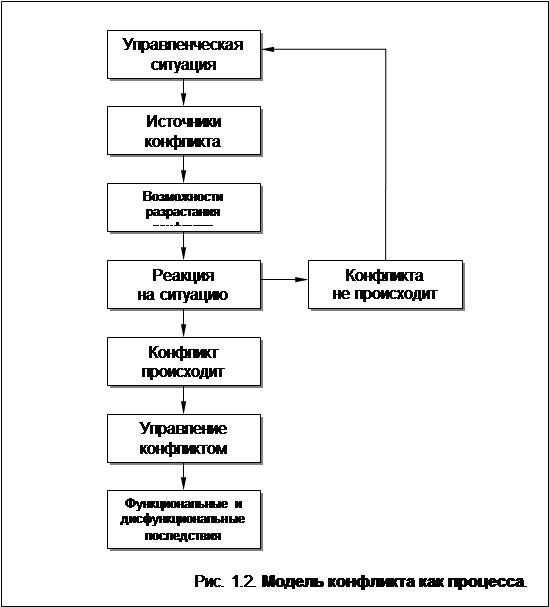 Рис.1.2 представляет модель конфликта как процесса. Из нее видно, что существование одного или более источников конфликта увеличивает возможность возникновения конфликтной ситуации в процессе управления. Однако, даже при большой возможности возникновения конфликта, стороны могут не захотеть реагировать так, чтобы и дальше усугублять ситуацию. Однако во многих ситуациях человек будет реагировать так, чтобы не дать другому добиться цели. Настоящий конфликт часто проявляется при попытке убедить другую сторону или нейтрального посредника, что «вот почему