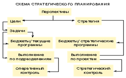 Как видно из схемы, перспективы и цели связаны между собой для выработки стратегии. Текущие программы ориентируют оперативные подразделения в их повседневной работе по обеспечению текущей рентабельности. Стратегические программы и бюджеты закладывают основы будущей рентабельности, что требует создания системы исполнения, построенной на управлении проектами. Стратегический план выражен стратегией корпорации. В нем содержатся решения относительно сфер деятельности и выбора новых направлений. В нем могут перечисляться основные проекты и задаваться их приоритеты. Обычно стратегический план не содержит количественных показателей.