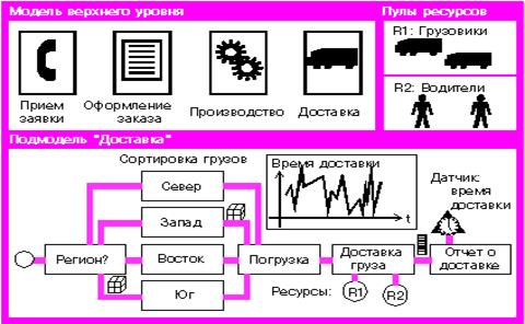 ReThink поддерживает анимацию потоков работ в ходе моделирования деятельности компании. Благодаря этому менеджер имеет возможность непосредственно наблюдать функционирование моделей, что повышает степень его доверия к результатам моделирования. Данная система обеспечивает создание иерархических моделей, позволяющих описывать процессы с различной степенью детализации. Это гарантирует простоту и естественность при создании сложных моделей больших компаний (рис. 1).
