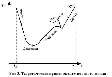 Различают малые циклы (кризис, депрессия, оживление, подъем), захватывающие около 7-11 лет и большие циклы, охватывающие от 48 до 55 лет.